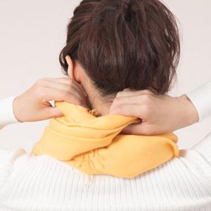 Hold the tip of the right side of the scarf with your right hand and bring it behind your left shoulder.